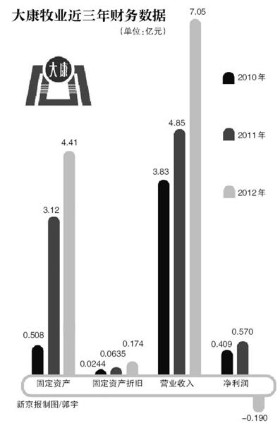 新京報記者查閱大康牧業2010年、2011年、2012年年報,發現公司這兩年的固定資產都出現了大幅增加,其中,2010年公司的固定資產為5000多萬元,2011年升至3.1億元,2012年增加至4.4億元。與之對應,2012年,大康牧業計提了1738萬元的固定資產折舊,而該年度大康牧業凈利潤為-1898萬元。