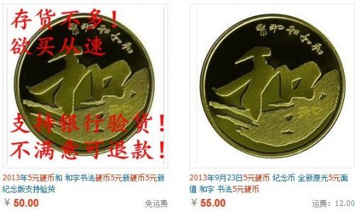 記者發現,盡管央行昨天才發行5元和字紀念幣,但是當天不少淘寶賣家已經做起了交易,5元硬幣在發行當日已經在淘寶上加價出售,而在24日下午登陸淘寶查閱時,現身淘寶一天多時間的5元硬幣已經漲至55元,暴漲10余倍。