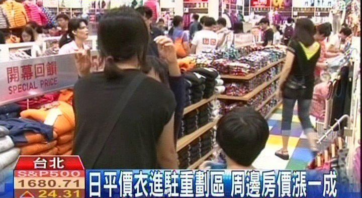 據臺灣TVBS網站報道,臺灣經濟不景氣,但國際平價服飾品牌卻完全沒受到影響,目前傳出美國的GAP以及瑞典的H&M都打算在明年進駐臺灣開店,3年前進入臺灣的日本UNIQLO,上午第40家分店開幕,避開百貨業一級戰區,選在新莊頭前重劃區開設近1萬平米的店面,不但造成民眾排隊搶購,業者進駐,還帶動周邊房價漲幅超過1成。