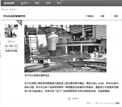 根據截屏圖片顯示,今年4月3日20:54,“@_-冰翼-_”發布了一條微博,稱“北京順義神秘的和園景逸大酒店是個超五星的豪華酒店……而中石化每個高層領導都有一套別墅或總統套間為其服務,——領導們,清明節快樂!”該微博同時還上傳了一張貌似酒店內部遊泳池照片。