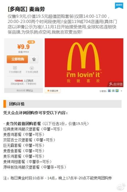 大眾點評網上昨天上午推出,麥當勞團購,“價值19.5元超值團購套餐,僅售9.9元,全國119城704店通用”。不過隨著麥當勞發布澄清微博,大眾點評網也將這個團購關閉。