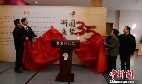 圖為葉榮寶等人為浙商改革開放35周年紀念活動揭幕。 浙江工商大學 攝