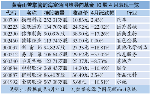 從股價表現來看,海富通內需熱點和國策導向兩產品持股均為伊利股份、新宙邦、信邦制藥、易華錄、華夏幸福、贛鋒鋰業、魚躍醫療、模塑科技、杉杉股份和金隅股份。但4月份,7只股票下跌,其中魚躍醫療下跌22%,易華錄後復權股價月跌幅達到15.33%。另外,新宙邦、信邦制藥等月度跌幅都接近20%。伊利股份表現最好,4月份上漲了3.54%。