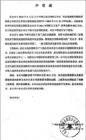 昨天下午,金逸影視對外發表《聲明函》,向武漢市國資委“深表歉意”,稱為簡化團體票內部管理工作,公司在對武漢國資委以及相關國資體係內單位銷售團體票時,均使用統一的國資係統價格體係,而金逸影視在進行團體票消費統計時,將國資價格體係內的所有消費進行合並計算,並將上述消費金額合並披露至武漢市國資委名下。