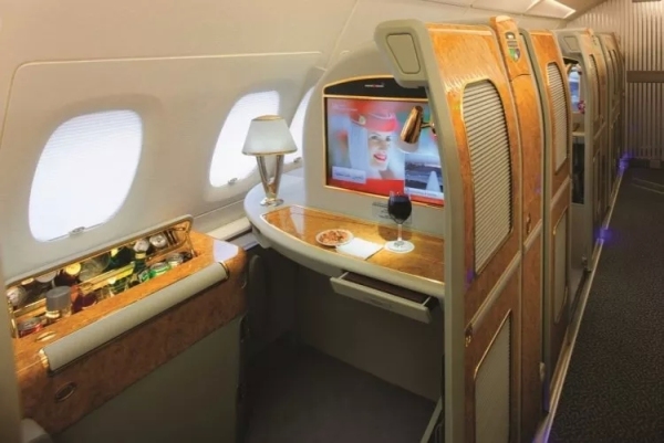 阿聯酋航空A380機艙內裝飾有裝滿鮮花的壁挂,還有古典胡桃木和大理石裝飾的浴室。整個機艙分為兩層,上層為頭等艙和商務艙,頭等艙內有14個私人套間。下文描述了頭等艙內可以享受的奢華服務:
