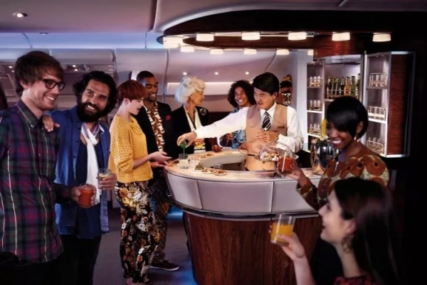 - 對頭等艙和商務艙乘客開放的機上休息室內設有圓形長椅,座位上也有安全帶,休息室提供小點心和飲料;