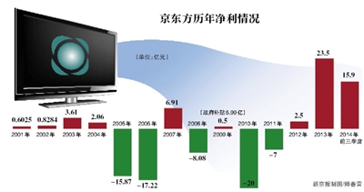 京東方2001年到2004年一直盈利。2005年京東方虧損15.87億元,2006年又虧損17.22億元,最終被戴上“ST”的帽子,2007年盈利6.91億元、2008年虧損8.08億元。2009年京東方靠政府6.99億補貼扭虧為盈,實現凈利潤0.5億元。但2010年再次陷入巨虧20億元泥潭,2011年虧損7億元。2012年京東方實現凈利2.5億元,但扣除非經常性損益後凈利潤仍然虧損5.44億元。2013年凈利潤增長至23.5億元。2014年前三季度,京東方實現凈利潤15.9億元。