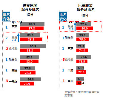 去年雙十一,當當自營商品在11月12日就全部發貨,快遞準點率達90%以上。根據零點調查公司的調研報告顯示,去年第四季度當當送貨速度躍居電商行業第二名。同時當當運費包郵政策也是行業公認最少的:滿39元即包郵。