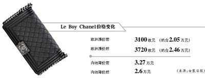 據美國《女裝日報》報道,11.12款手袋在中國內地的售價從先前的3.82萬元降到3萬元,與漲價後的歐洲價格相比,價差從1.47萬元縮小到1800元;le Boy手袋中國內地的價格從原本的3.27萬元下調至2.6萬元,兩地差價縮小至1400元。