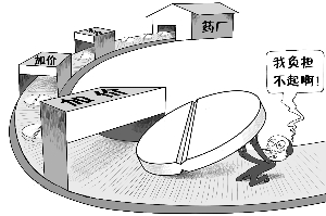 “以藥養醫”同時催生了藥品在流通領域的虛高價格。如韋飛燕所說,藥企不是不想降,而是不敢降。韋飛燕之所以“自揭家醜”,是因為一些藥企並非虛高藥價的受益者。降下的“虛火”實際上是醫生口中的“肥肉”,醫生不開藥,藥企的銷售量自然跌下來。因此,在招標環節,一些藥企在上報藥品零售價時,不僅將專利、獨家研發等成本囊括進去,甚至還包括了二次議價、醫院醫生收取回扣的成本,這就是為什麼許多藥品出廠價相對合理,幾經轉手,到了患者手里卻近乎“天價”的原因。