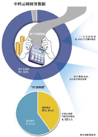 不過,根據中科雲網的公告,目前公司2014年經審計的凈資產已為負值,公司可能面臨退市風險。根據2014年度業績快報,中科雲網資產負債率為97.55%,其中主要負債包括ST湘鄂債、1.1億元信托貸款和4000萬元銀行借款、部分預收賬款、應付供貨商貨款等。