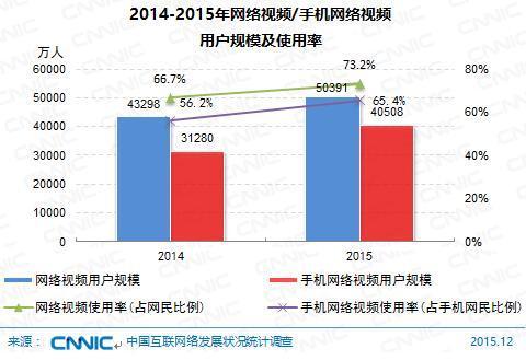 根據中國互聯網絡信息中心 (CNNIC) 近期發布的《第37次中國互聯網絡發展狀況統計報告》,截至2015年12月,中國網絡視頻用戶規模達5.04億,較2014年底增加7093萬,網絡視頻用戶使用率為73.2%,較2014年底增加了6.5個百分點。其中,手機視頻用戶規模為4.05億,與2014年底相比增長了9228萬,增長率為29.5% 。手機網絡視頻使用率為65.4%,相比2014年底增長9.2個百分點。