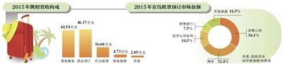 攜程財報顯示,2015年,攜程在票務服務領域的收入為44.54億元,約佔全部營收的38.74%。在勁旅咨詢公布的2015年中國在線機票預訂市場份額排名中,攜程的市場份額為32.4%,排在去哪兒網之後位列第二。