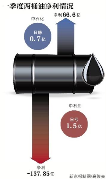 新京報記者計算發現,中石油一季度日虧1.53億元,中石化一季度則日賺0.74億元。