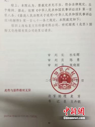 中新網北京7月5日電(記者 張曦)7月4日晚10:50分,北京知識產權法院宣布“中國好聲音”節目名稱歸屬案復議結果,維持該院此前裁定,責令上海燦星文化傳播有限公司(以下簡稱燦星)及其相關方立即停止在歌唱比賽選秀節目的宣傳、推廣、海選、廣告招商、節目制作過程中使用包含“中國好聲音”、“The Voice of China”字樣的節目名稱和相關注冊商標。