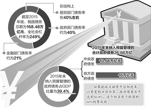 相對來說,其他部門的債務率並不太高。李揚介紹,截至2015年底,我國債務總額為168.48萬億元,全社會杠桿率為249%。其中,居民部門債務率在40%左右,金融部門債務率約為21%,政府部門債務率約為40%。如果考慮到一些融資平臺債務及或有債務,通過一個折扣劃入政府債務總額,政府部門債務率會有較大幅度上升,達到57%。