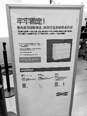 在抽屜櫃、鬥櫃的展區,記者從售賣的數十種產品中看到百靈、胡鐸、馬爾姆等多個係列的不同規格和樣式的抽屜櫃。在每一個展示櫃的價格標簽上,都用中英雙語寫了“相關提示”,“絆倒危險——未固定的家具可能會翻到倒。此家具須利用隨附的安全配件將其與牆面固定,防止翻倒。”