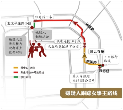 唐女士從銀行出來後,在慈雲寺橋乘坐671路公交車,在農業展覽館換乘地鐵10號線,最後在牡丹園地鐵站下車步行返回北太平莊路小區。沿途監控視頻顯示,嫌疑人從唐女士離開銀行後就一路尾隨在其身後,一同乘坐公交和地鐵,在農業展覽館地鐵站內,由于乘客眾多,嫌疑人怕跟丟唐女士,甚至直接逃票,跟隨其他乘客身後闖卡進入地鐵,出站時補票,隨後快速奔跑跟上。