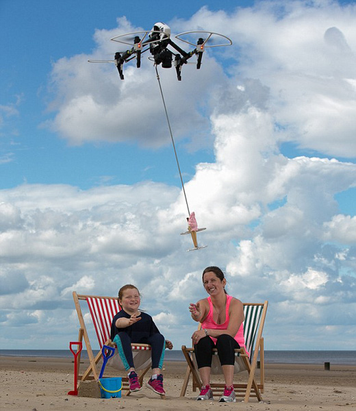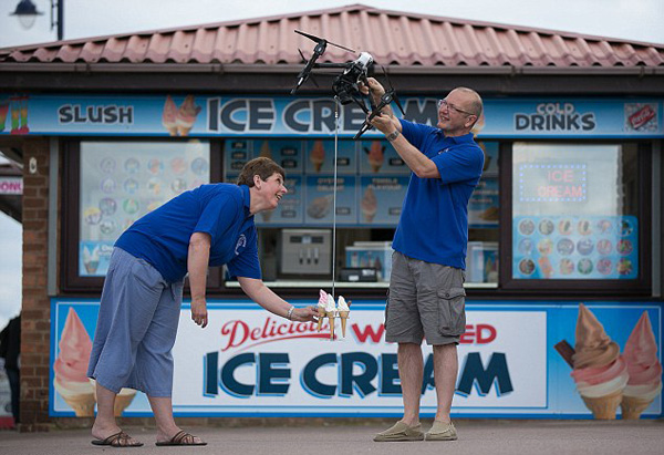 沙灘愛好者們再也不用浪費時間跑去商店購買冰激淩了。近日,無人機傳送冰激淩的工具在林肯郡的梅布爾索普進行了成功試驗,用類似籃筐的工具運載冰激淩,一次性可以運載4支,該工具與無人機主體以金屬桿相連,以保持穩定。該運輸方案正在等待民航局批準,以確保海邊遊客的安全。