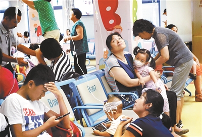 7月17日,北京兒童醫院門診樓,不少家長帶著孩子在輸液