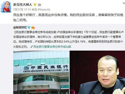 對于近期中國泛海集團董事長盧志強連續增持民生銀行股份的行為。史玉柱17日在其微博中點評“民生是個好銀行,我的民生股份沒賣。”,他同時還表示,民生銀行混業步伐有點慢。