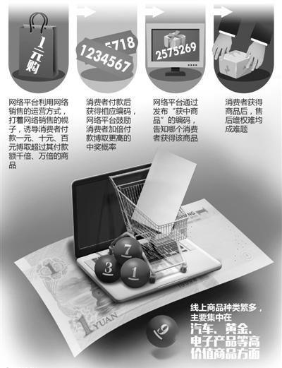 經媒購委調查,現階段確實有很多網絡平臺利用網絡銷售的運營方式,誘導消費者付款一元、十元、百元博取超過其付款額千倍、萬倍的商品,付款後獲得相應編碼,鼓勵加倍付款博取更高的中獎概率,並通過發布“獲中商品”的編碼,告知哪個消費者獲得了該商品。其線上商品種類繁多,主要集中在汽車、黃金、電子產品等高價值商品方面。