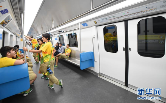 8月1日,奧運會志願者在乘坐里約地鐵4號線列車。 新華社記者 王昊飛攝