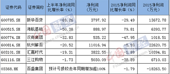 除新華百貨以外,海航基礎、漢商集團、杭州解百、匯嘉時代、三江購物等A股上市公司的上半年業績也紛紛出現下滑,下滑幅度為69.26%、50.38%、32.83%、20.52%、19.31%和1.73%。