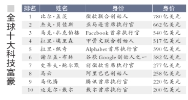福布斯10日發布了第二屆科技行業百富榜顯示,全球排名前100的科技富豪合並財富達到8920億美元,較去年增長6%。中國的馬雲、馬化騰躋身榜單前十。