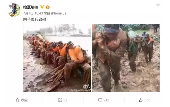 還有一條,是那幾天全國多地下大雨,“向子弟兵致敬”。