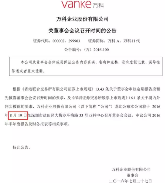 第三,8月19日(下周五),萬科又將在深圳萬科中心召開董事會會議,審議公司2016年半年度報告及財務報表等相關事項。屆時,代表華潤、萬科管理層以及獨董的各方會不會激烈交鋒,惹人關注。