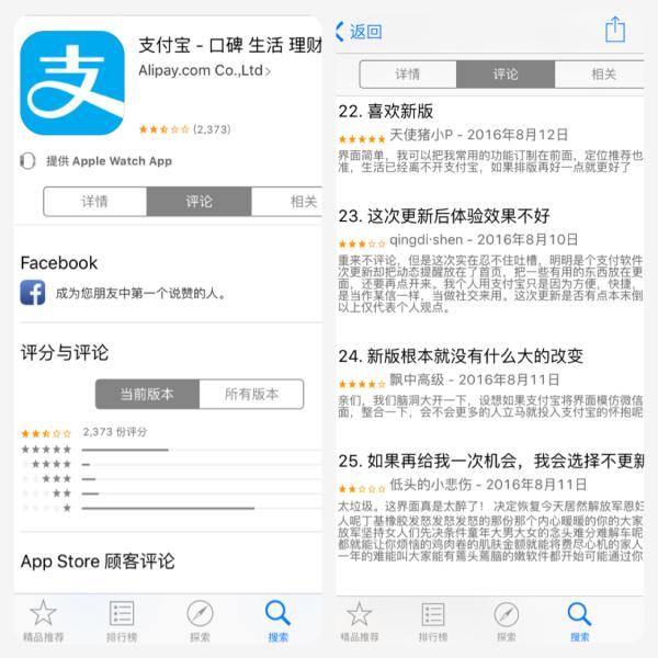 剛發布不久的新版支付寶試水“社交”,將“朋友圈”放在了首頁,並給用戶“推薦可能認識的人”。這一在支付寶眼里看來是戰略級意義的改版,卻在用戶那兒遭遇如潮差評。截至8月17日發稿,支付寶在蘋果應用商店的評分直接從三星半(歷史版本的平均評分)跌至兩星半。