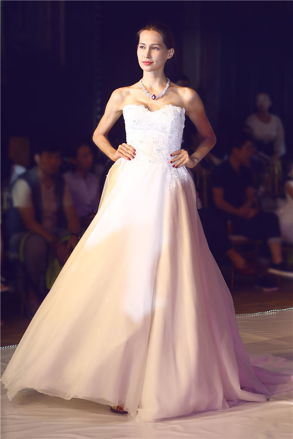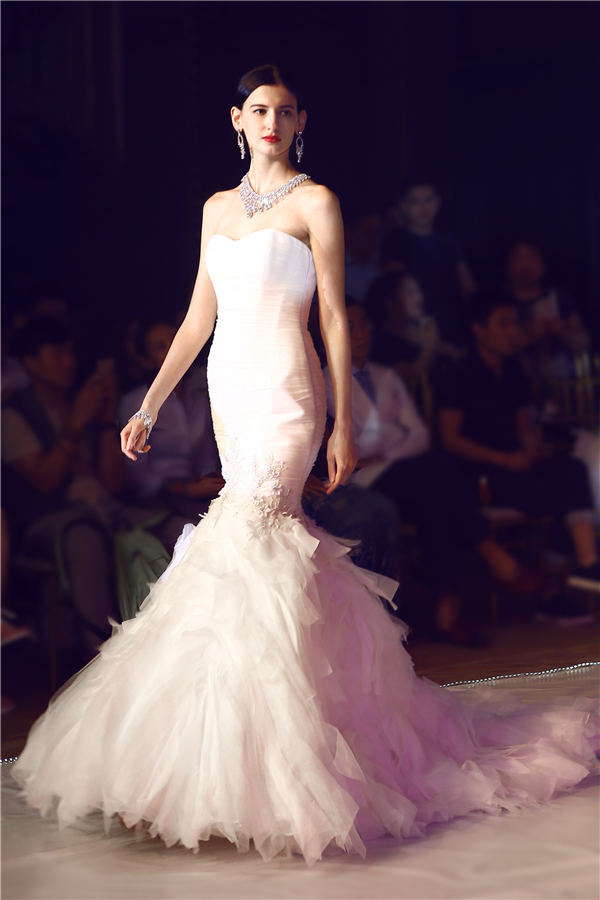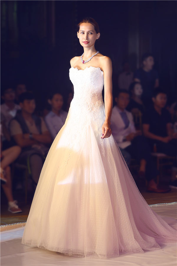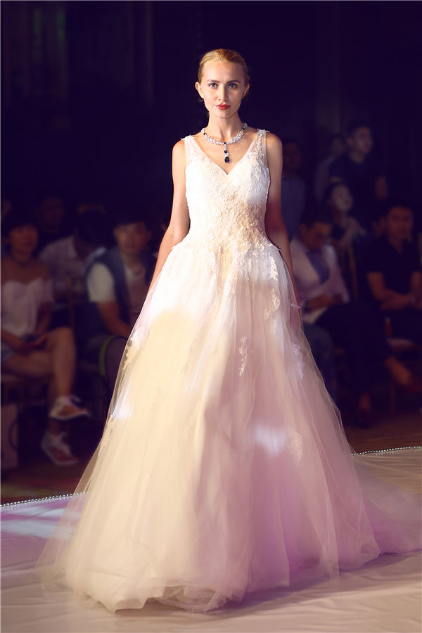 現場樂曲聲聲,悠揚婉轉,一場珠寶邂逅婚紗的主題秀在這里曼妙上演。精致的婚紗在珠寶的映襯下顯得更加華麗,映照出新娘最幸福的臉龐。此次婚紗秀千葉珠寶共展出星扉係列、三瓣花係列、花園係列、高級珠寶係列四大係列珠寶,以奪目的光芒和華美的設計為贏得賓客陣陣掌聲。無論是珍珠的柔美,還是鑽石的閃耀,每一件千葉珠寶都飽含著彼此對愛情的期許與承諾。