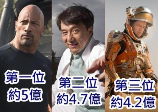 數完女星自然就要數男星,今年吸金力最強的男星就是人稱“The Rock”的大只佬男星強森(Dwayne Johnson),上年憑兩部熱賣電影《速度與激情7》(The Fast and the Furious 7)和《末日崩塌》(San Andreas)狂攬6,450萬美元(約5億港元),比起上年吸多了超過一倍,相比起女星方面,足足高了1.4億港元。