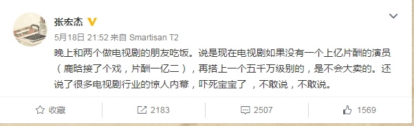 【摘要】 5月18日,張宏傑曾發微博稱“晚上和兩個做電視劇的朋友吃飯。”8月26日,國家新聞出版廣電總局黨組發布了關于巡視整改情況的通報,其中關于電視劇行業的通報涉及遏制天價片酬和明星炫富。