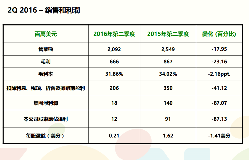 康師傅控股2016年中期業績報表顯示,截至2016年6月30日,康師傅實現收益約41.91億美元,同比下跌13.94%;毛利約13.26億美元,同比下跌17.21%;毛利率下跌1.25%至31.64%;公司股東應佔盈利6967.5萬美元,同比減少64.75%;根據財報中公布的數據,扣除利息、稅、折舊和攤銷前的利潤為2.06億美元,同樣遠低于去年同期3.5億美元的水平。而如果單看今年二季度業績,銷售額和凈利潤降幅最甚,分別下滑17.95%和87.13%。