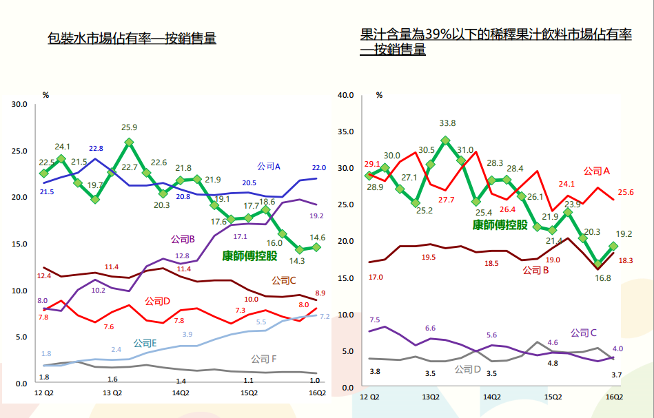 飲品中,以包裝水和稀釋果汁飲料市場佔有率來看,與13年Q2最高峰對比,均有大比例下滑。