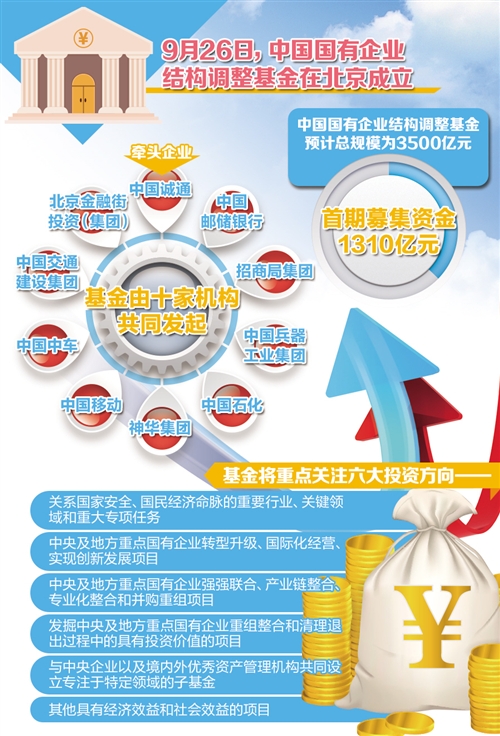 預計總規模為3500億元的中國國有企業結構調整基金9月26日正式在北京成立。基金將重點投資于中央企業產業結構調整,包括企業提質增效、轉型升級、科技創新、國際化經營和不良資產重組等項目。
