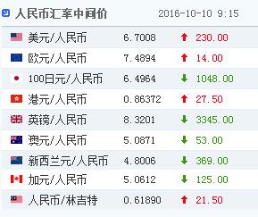 中國人民銀行授權中國外匯交易中心公布,2016年10月10日銀行間外匯市場人民幣匯率中間價為:1美元對人民幣6.7008元,1歐元對人民幣7.4894元,100日元對人民幣6.4964元,1港元對人民幣0.86372元,1英鎊對人民幣8.3201元,1澳大利亞元對人民幣5.0871元,1新西蘭元對人民幣4.8006元,1新加坡元對人民幣4.8717元,1瑞士法郎對人民幣6.8445元,1加拿大元對人民幣5.0612元,人民幣1元對0.61890林吉特,人民幣1元對9.2916俄羅斯盧布,人民幣1元對2.0617南非蘭特,人民幣1元對166.59韓元,人民幣1元對0.54885迪拉姆,人民幣1元對0.56043里亞爾。