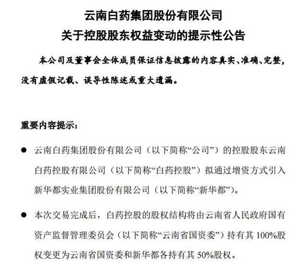 12月29日傍晚,因控股股東籌劃混合所有制改革重大事項而停牌近半年的雲南白藥(000538.SZ)拋出重磅信息。其公告稱,經雲南省政府批準,雲南省國資委、 新華都 實業集團股份有限公司(下稱新華都)與白藥控股三方簽訂了相關協議,新華都作為增資方取得白藥控股50%股權,增資總額為253.7億元。