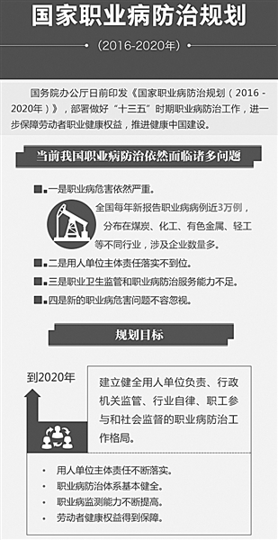 科學防治,規劃先行。日前,國務院辦公廳印發《國家職業病防治規劃(2016-2020年)》(以下簡稱《規劃》),部署做好“十三五”時期職業病防治工作,進一步保障勞動者職業健康權益,推進健康中國建設。