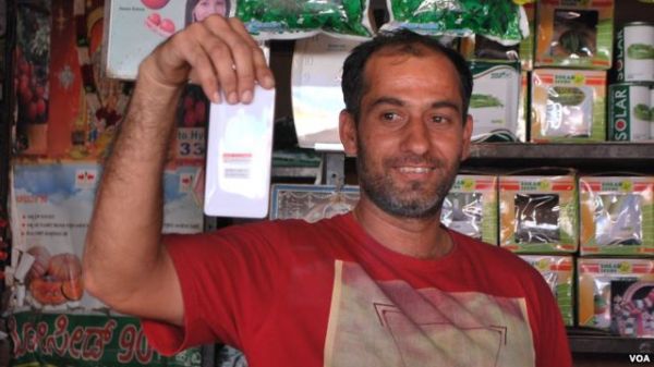 印度邁索爾一位集市攤主展示他的小米手機。(美國之音電臺網站)