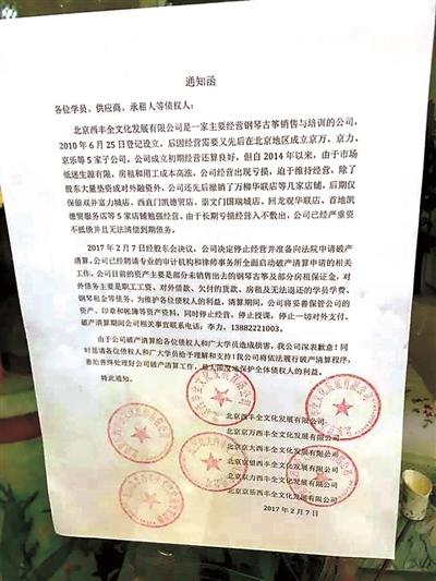 李力表示,“公司對四家商場僅拖欠了2月1日至8日的租金,目前已經聘請專業的審計機構和律師事務所全面啟動破產清算申請的相關工作。公司目前的資產主要是部分未銷售出去的鋼琴、古箏及部分房租保證金,對外債務主要是職工工資、對外借款、欠付的貨款、房租及無法退還的學員學費、鋼琴租金等債務。為維護各位債權人的權益,清算期間,公司將妥善保管公司的資產、印章和賬簿等資產資料,同時停止經營、停止授課,停止一切對外支付。”