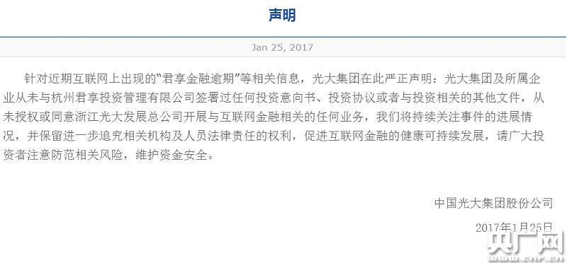 早在2016年6月30日,浙江光大發展總公司發布了一則關于戰略投資企業及戰略合作夥伴的聲明。聲明中明確君享金融是其子公司的戰略合作夥伴,但在君享金融出事當天,也就是2017年1月8日,光大方面卻將上述聲明中關于君享金融的內容刪除。