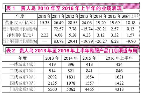 貴人鳥起家于傳統運動鞋服生產業務,在2014年上市之後,門店數量開始出現大規模萎縮。2013年至2016年上半年的財報顯示,貴人鳥在國內布局的門店家數一路下滑,已經由2013年時的5560家下滑至2016年上半年的4313家。