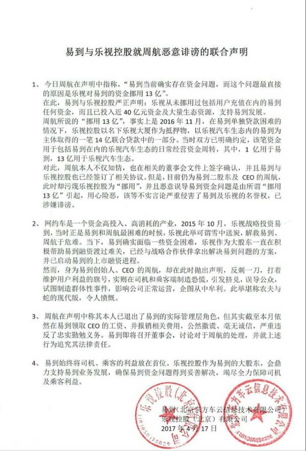 4月18日晚間,針對易到創始人周航指責樂視挪用易到資金13億的說法,樂視和易到公司發布聯合聲明稱,周航目前仍為易到二股東及CEO,截至當月仍在易到領取工資,其不實言論影響了易到和樂視的名譽權,已涉嫌誹謗,“堪稱農夫與蛇的現代版”。