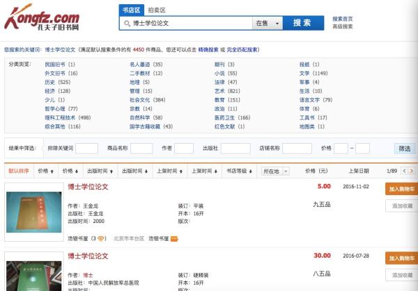 孔夫子舊書網有商家售賣博士學位論文,涉清華北大等多家高校