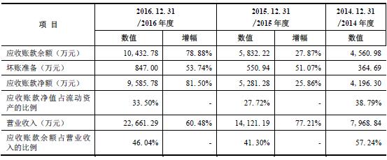 2013年至2016年,星雲股份應收賬款余額分別為2,486.76萬元、4,560.98萬元、5,832.22萬元、10,432.78萬元,應收賬款余額佔營業收入的比例分別為41.65%、57.24%、41.30%、46.04%。應收賬款凈額分別為2,308.82萬元、4,196.30萬元、5,281.28萬元、9,585.78萬元,應收賬款凈值佔流動資產的比例32.99%、38.79%、27.72%、33.50%。