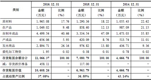 2013年至2016年,公司存貨賬面價值分別為2,243.82萬元、4,666.78萬元、6,963.79萬元和10,608.26萬元,佔期末流動資產的比例分別為32.06%、43.14%、36.55%和37.08%。