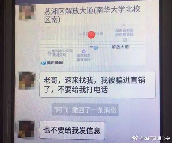 通報稱,5月7日,紅湘派出所接到來自益陽市桃江縣的胡先生報警:稱其收到弟弟胡某的求助信息,弟弟被人騙入了衡陽的傳銷組織。當日14時許,民警通過胡先生提供的微信定位立即出警到現場進行排查,在解放西路一民房內找到了胡某,並在房間內發現了10名參與傳銷組織人員,遂帶回所內盤查。